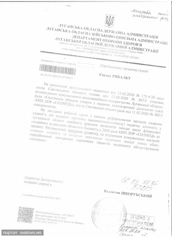 26.02.2020 року Міністерства охорони здоров'я України скерувало звернення народного депутата України О. Лукашева з питання функціонування Сватівської обласної психіатричної лікарні до Департаменту охорони здоров'я Луганської ОВЦА- ОДА.